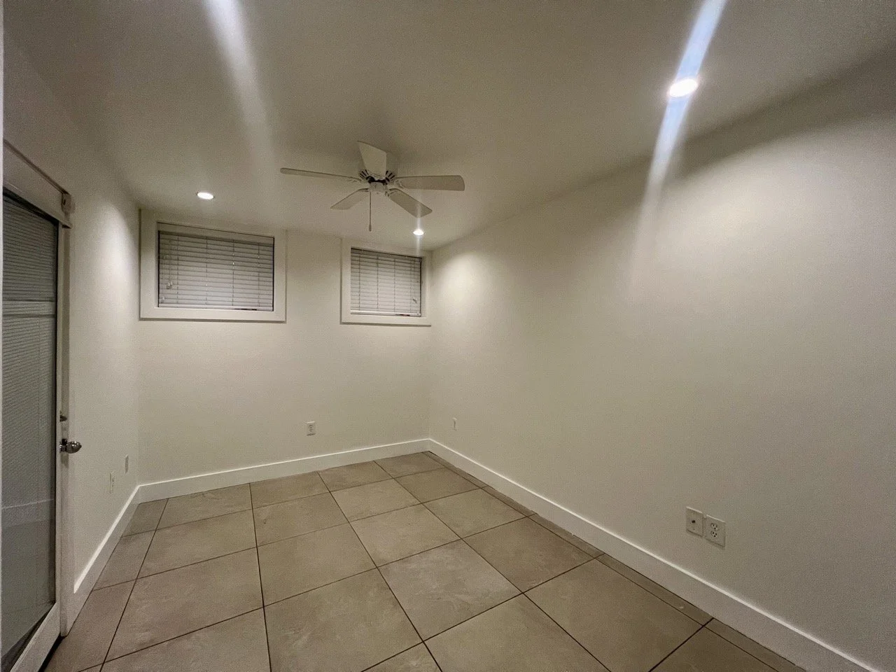 The bedroom area features a sizable closet, room for a full or queen bed and ceiling fan.
