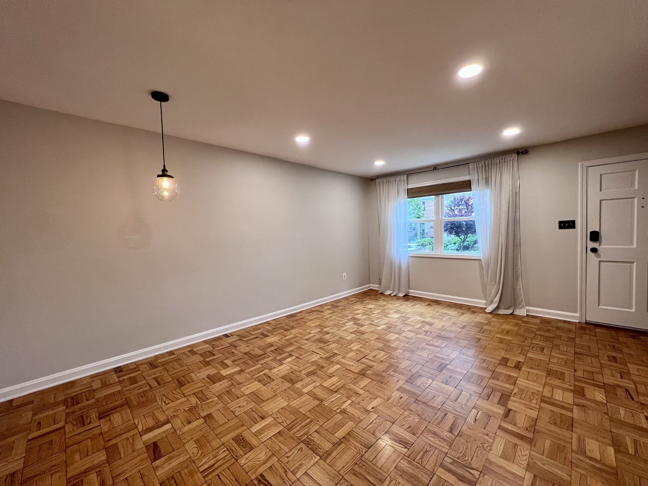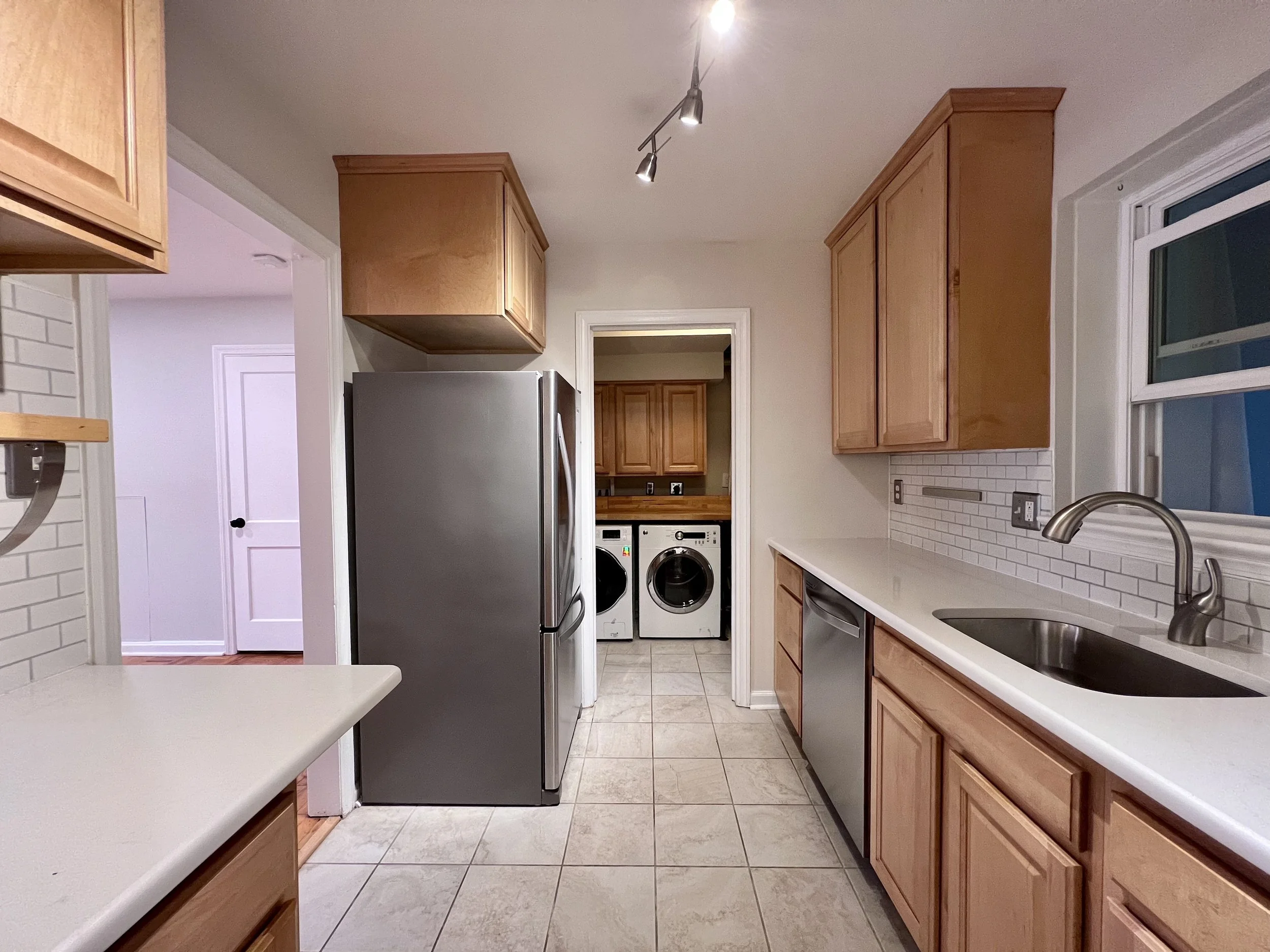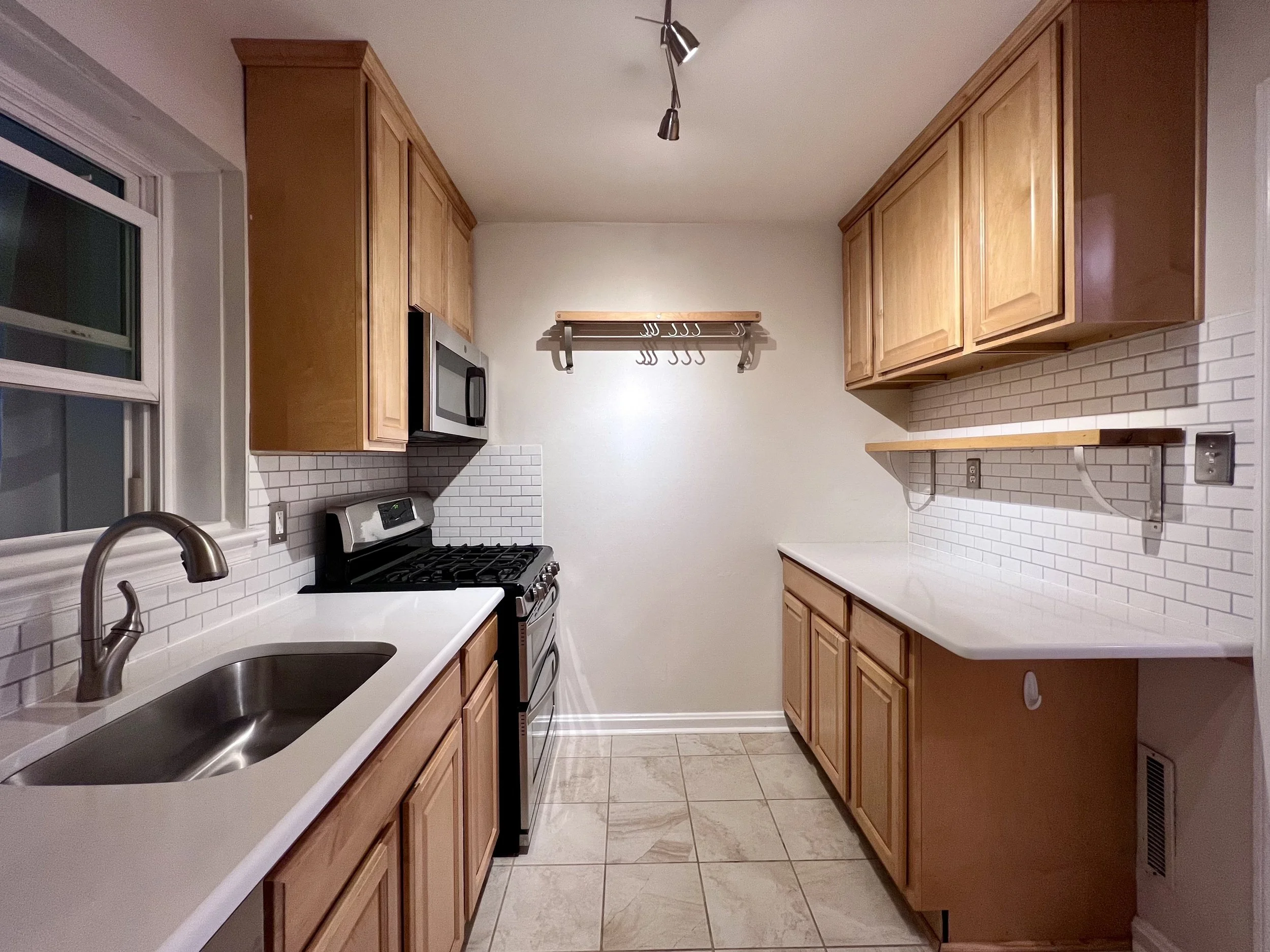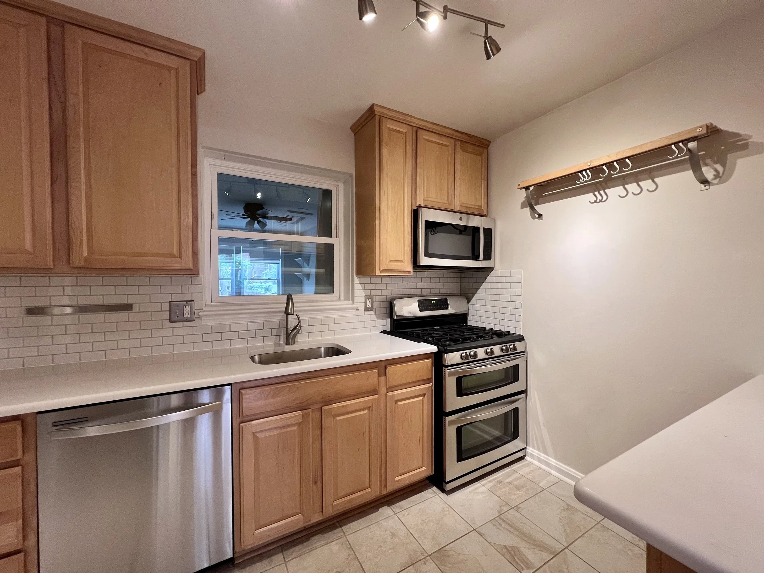 Step into the sun drenched living room with a dining corner and powder room on the main level. The updated kitchen with gas range, double oven, stainless steel appliances and subway tile backsplash has everything you need.
