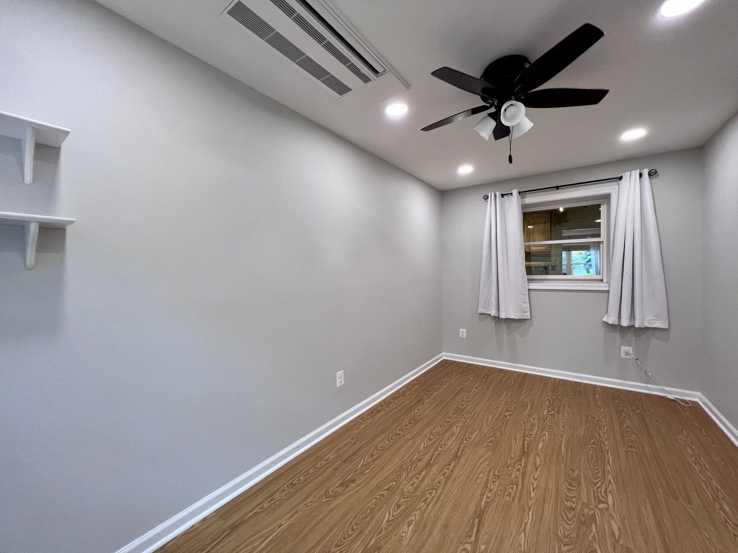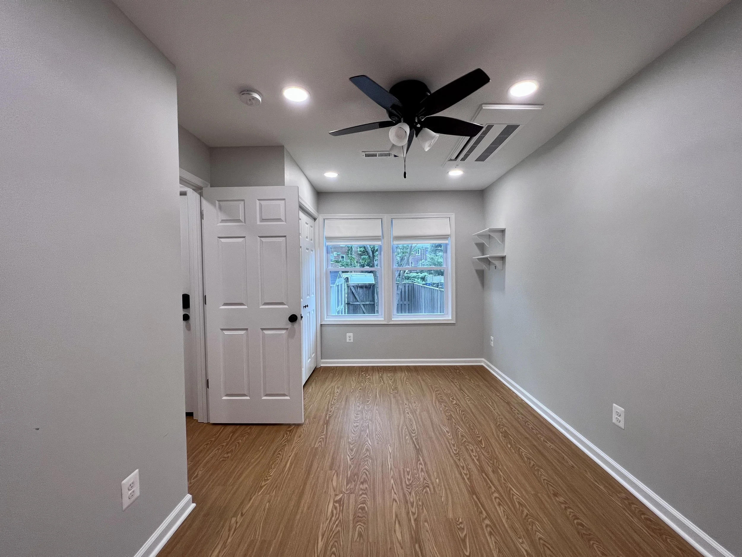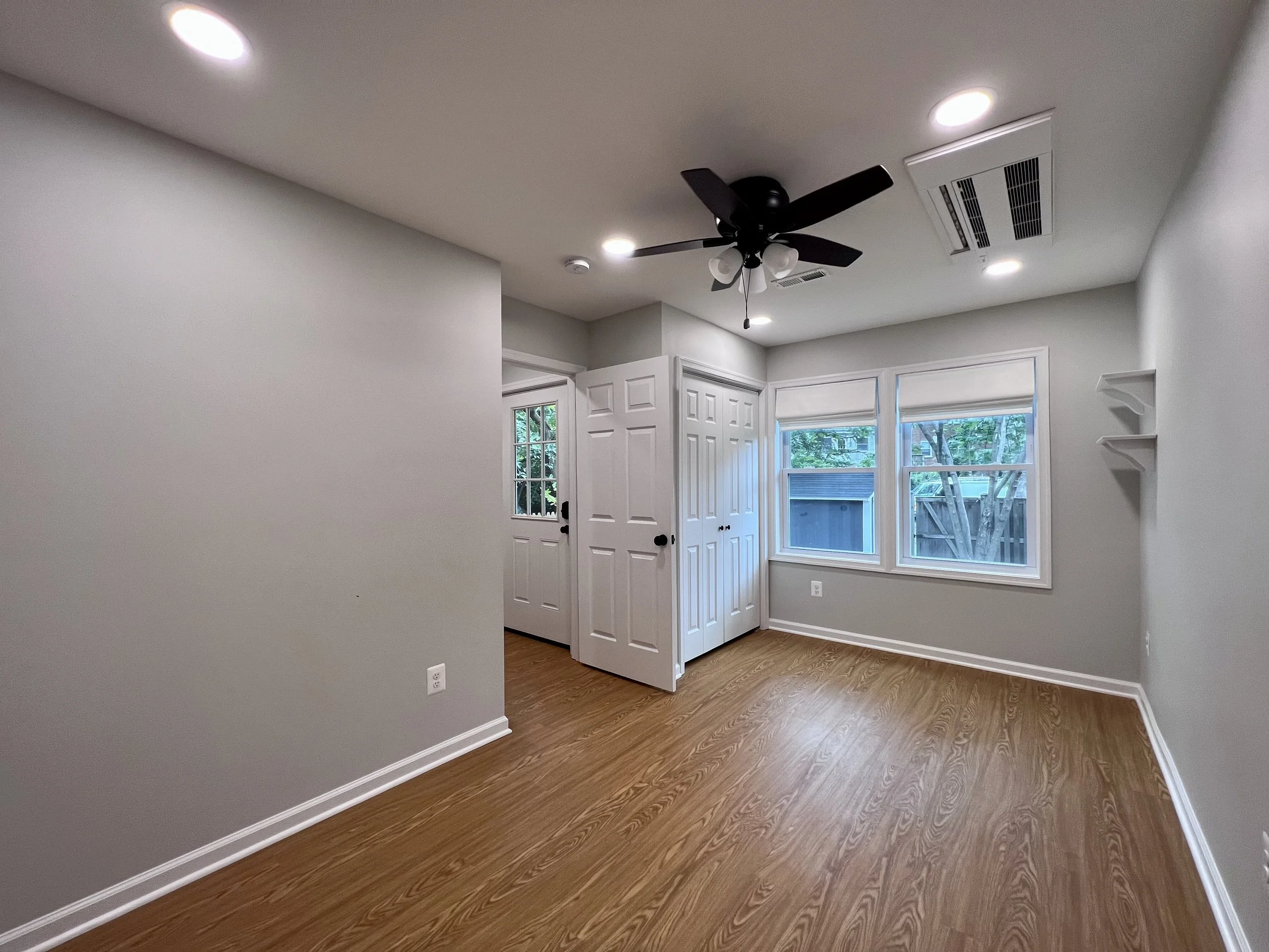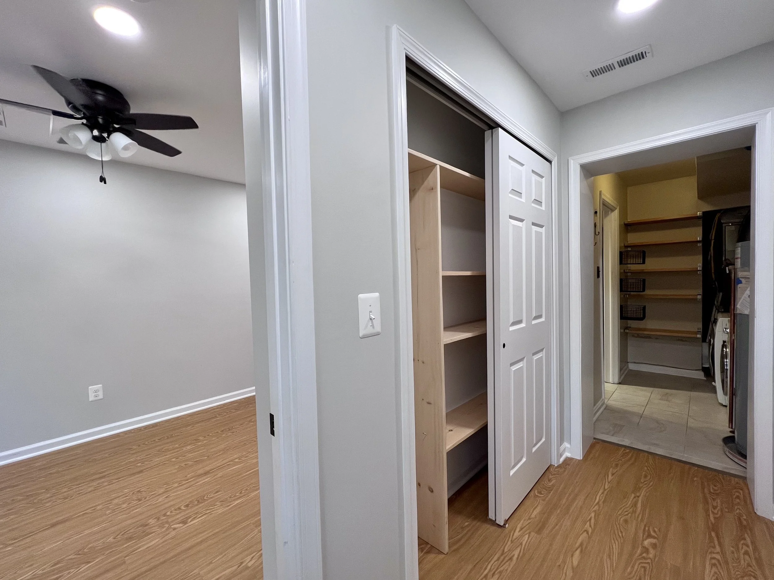 Tucked behind the kitchen you'll find extra closet space as well as the newly renovated 3rd bedroom featuring separate temperature control via mini split, recessed lighting, remote-controlled ceiling fan and awesome built-in shelves!